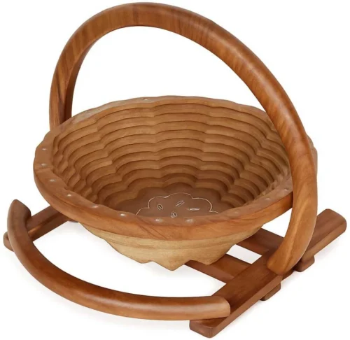HANDICRAFT Wooden Round Portable & Foldable basket With Handle & Stand For Kitchen & Dining Table